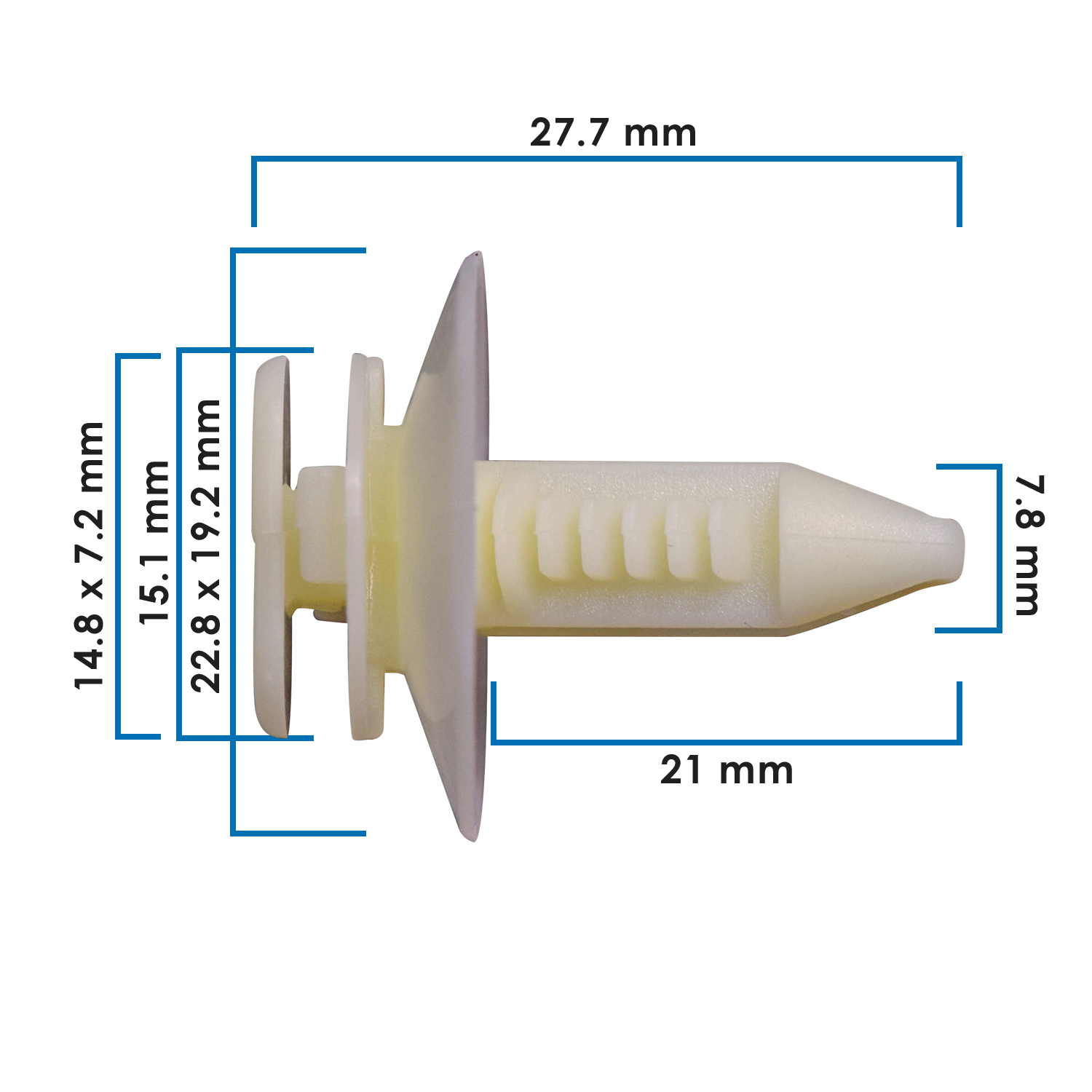 Pijas plásticas para tapicería Chevrolet, ideales para fijar paneles interiores, forros de puertas, molduras y techos. Fabricadas en nylon resistente, compatibles con múltiples modelos GM. Aseguran una sujeción firme y duradera sin dañar la tapicería.