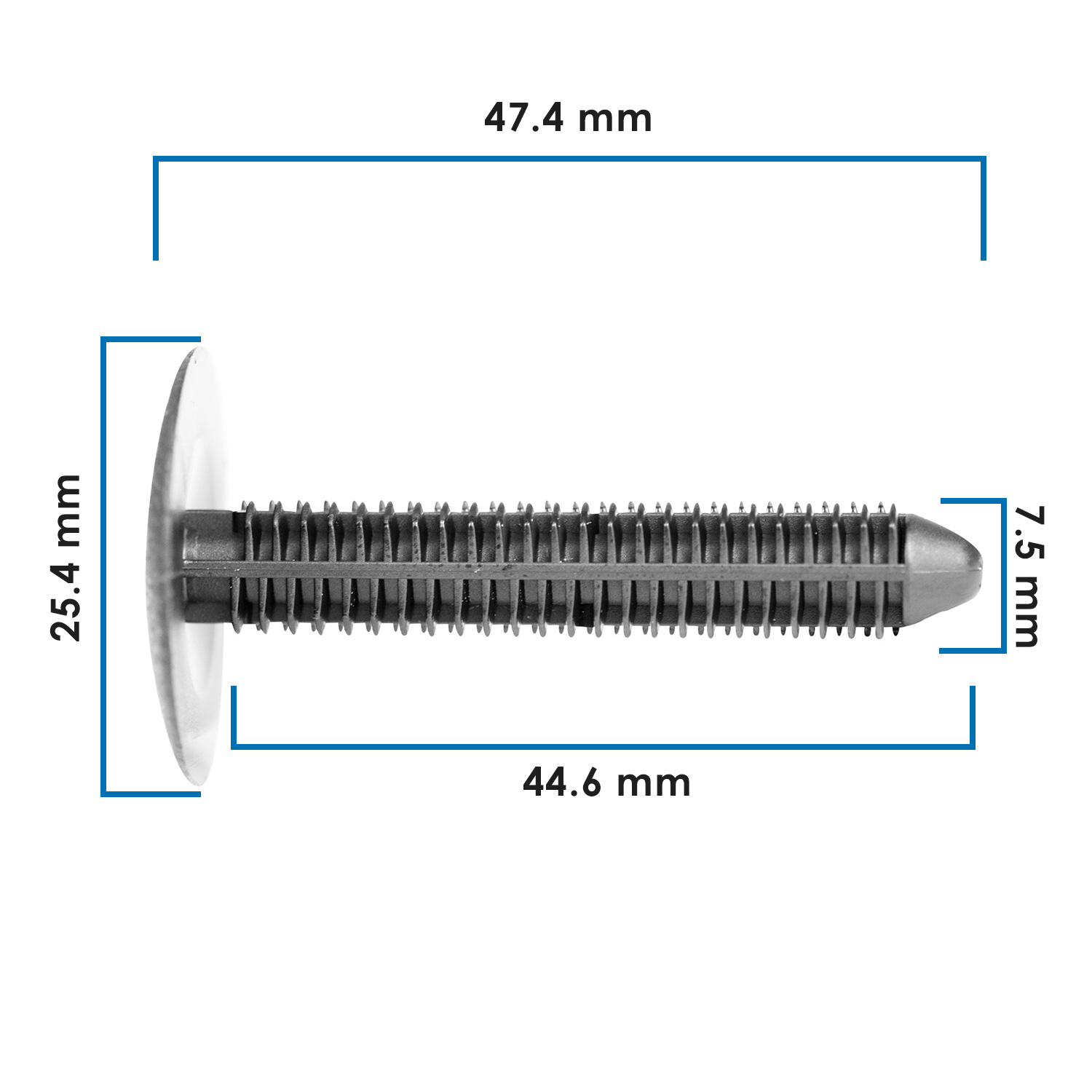 Pija plástica negra larga para tapicería, ideal para asegurar paneles interiores, techos, molduras y forros en vehículos. Fabricada en nylon de alta calidad, brinda una sujeción firme y resistente para aplicaciones automotrices profesionales.