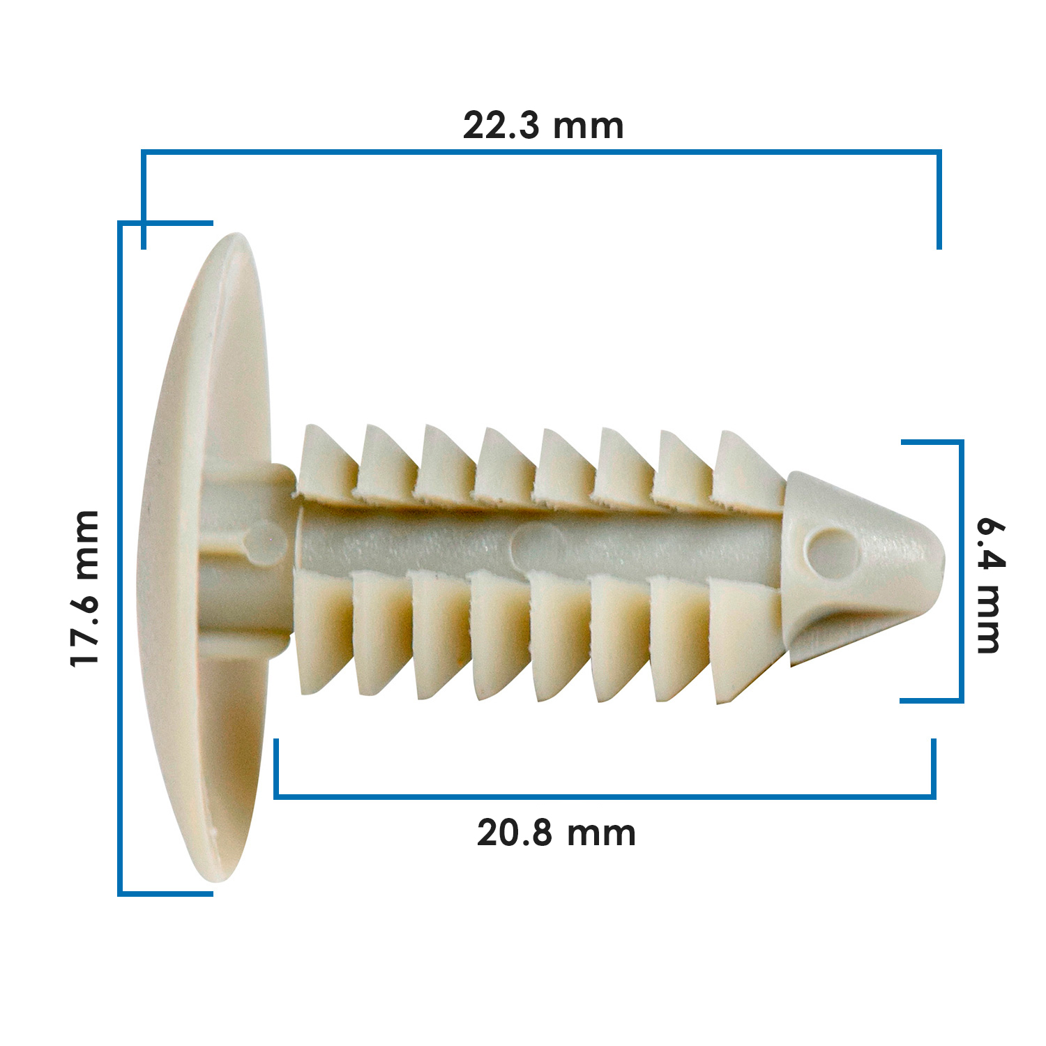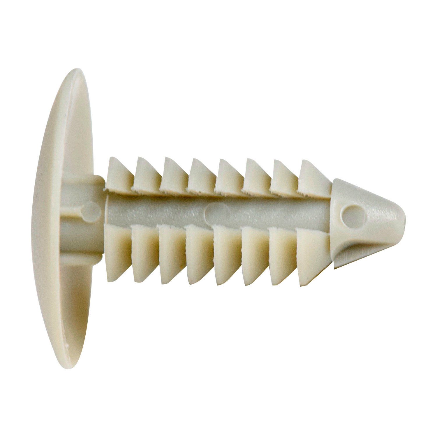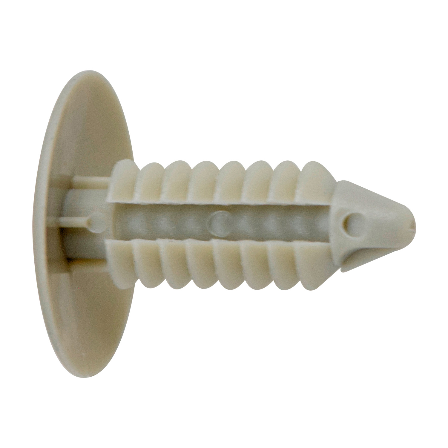 Retenedor de tapicería universal en nylon gris, diseñado para sujetar paneles, forros y molduras en una gran variedad de vehículos (Ford, Chrysler, GM y más). Compatible con orificios de 6.4 mm.