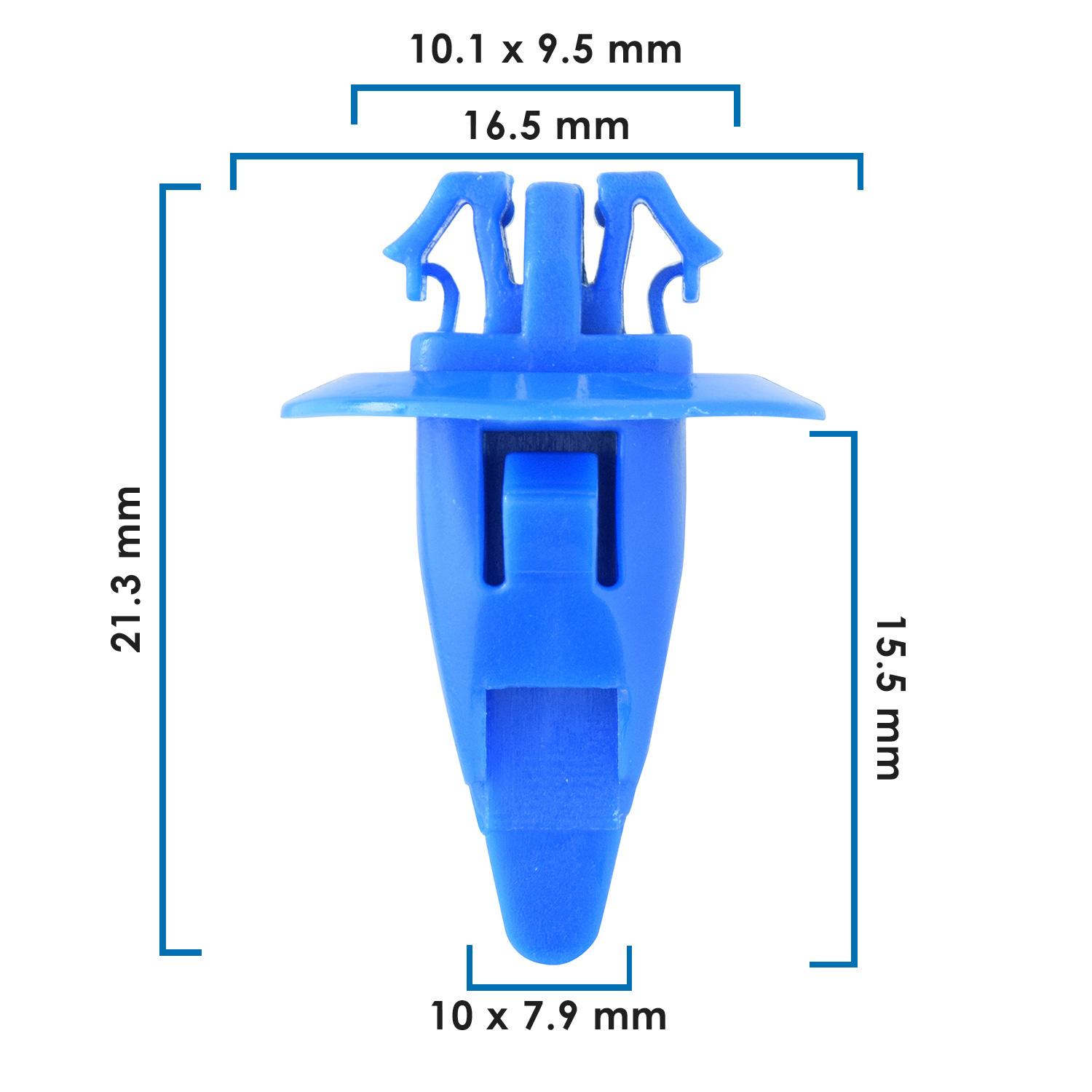 Grapa larga para moldura de salpicadera Toyota (4 Runner, Tacoma, Tundra), tipo clip de nylon azul, ideal para fijar molduras laterales con ajuste seguro.